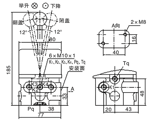 用途與特征: 4KQF型操縱氣閥是一種整體式多路氣控操縱氣閥。搬動(dòng)手柄可在四個(gè)個(gè)不同角度分別控制多路閥工作。具有其重量輕,體積小,對(duì)環(huán)境無污染, 靈敏度高得多等優(yōu)點(diǎn)。是5噸位以上自卸汽車氣路控制的一種理想元件。 4KQF型操縱氣閥的原始位置Pq口與T口是封閉的,各控制口K與Tq口相通。搬動(dòng)手柄可在四個(gè)不同角度。