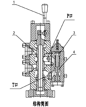 2、主閥的方向切換及節(jié)流原理,當(dāng)手柄(序1)處于中間位置時(shí)工作油口(A、B口)封閉,從油泵排出的油液從P口回到T口卸荷,油馬達(dá)停止。當(dāng)手柄處于右側(cè)時(shí),主閥芯(序2)向上移動(dòng),從P口流入的油液通過(guò)節(jié)流口流到A口,再?gòu)腁口流出驅(qū)使油馬達(dá)轉(zhuǎn)動(dòng),經(jīng)過(guò)油馬達(dá)后的油液從B口回到T口,這樣靠手柄板動(dòng)不同的傾斜角度,使主閥芯處于不同的位置來(lái)調(diào)節(jié)節(jié)流口的開(kāi)度大小,以達(dá)到油馬達(dá)的轉(zhuǎn)速調(diào)節(jié)。
