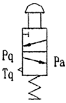 在氣控限位閥的限位桿行程范圍內(nèi)(即Pa口的閉合—開啟—閉合)實現(xiàn)車廂下降—舉升—下降往復(fù)變化過程,使車廂產(chǎn)生輕微抖動有利于將車廂內(nèi)的殘留物體卸掉。在連接示意圖(2)中搬動操縱氣閥的手柄換向至工作位置(Pq口與A口連通)將壓縮空氣經(jīng)氣控限位閥進入舉升閥的氣缸K1口實現(xiàn)液壓缸上升。當(dāng)車廂舉升到最大轉(zhuǎn)角位置時,限位機構(gòu)將氣控限位閥的限位桿壓下切斷其進氣口(Pq口與Pa口是斷開),Pa口與Tq口接通使舉升閥氣缸內(nèi)的壓縮空氣由氣控限位閥排入大氣。這時舉升閥回到中位,P口經(jīng)A口與T口連通回油,B口關(guān)閉車廂處于最高舉升位置狀態(tài),該閥的工作原理示意圖如下。