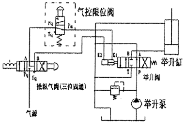 QXF型氣控限位閥的原始位置Pq口與Pa口是連通的(常開式結(jié)構(gòu),)。在連接示意圖(1)中搬動操縱氣閥的手柄換向至工作位置(Pq口與A口連通)將壓縮空氣經(jīng)氣控限位閥進入舉升閥氣缸使舉升閥換向?qū)崿F(xiàn)液壓缸上升。當(dāng)車廂舉升到最大轉(zhuǎn)角位置時,限位機構(gòu)將氣控限位閥的限位桿壓下切斷其進氣口(Pq口與Pa口是斷開),Pa口與Tq口接通使舉升閥氣缸內(nèi)的壓縮空氣由氣控限位閥排入大氣。這時舉升閥P口與T口瞬間連通,舉升缸即下降一段距離(車廂舉升轉(zhuǎn)角變小),隨車廂舉升轉(zhuǎn)角變小氣控限位閥的限位桿恢復(fù)原始狀態(tài)同時壓縮空氣經(jīng)該閥再次進入舉升閥氣缸使舉升缸,上升(車廂再次舉升到最大轉(zhuǎn)角位置)。